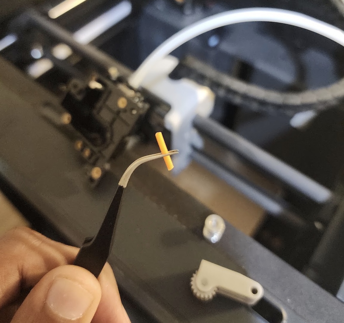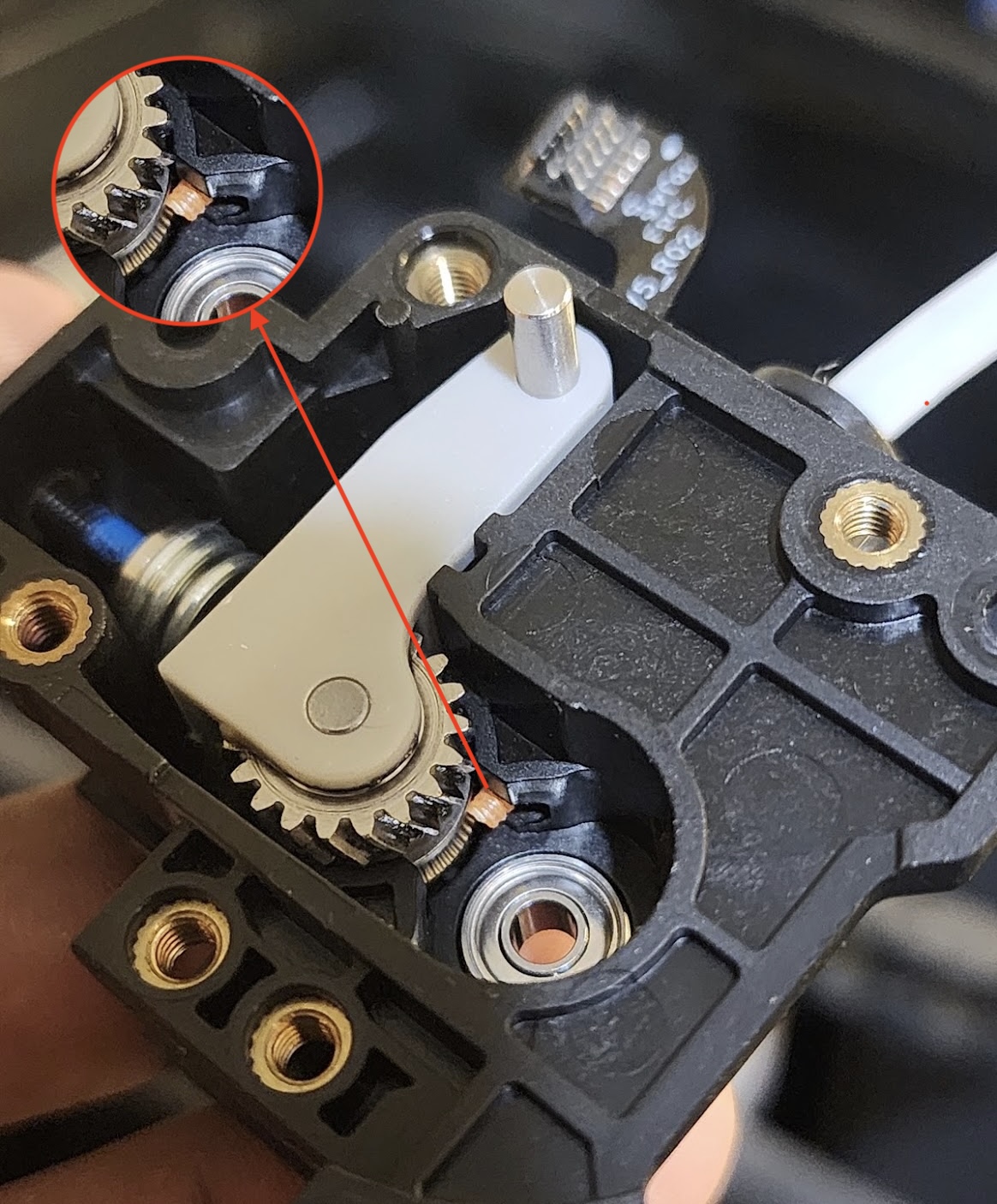 After not finding anything in detached the PTFE, I was now expecting something to be stuck in the the gears and I saw a tiny broken orange filament stuck in the gears.